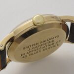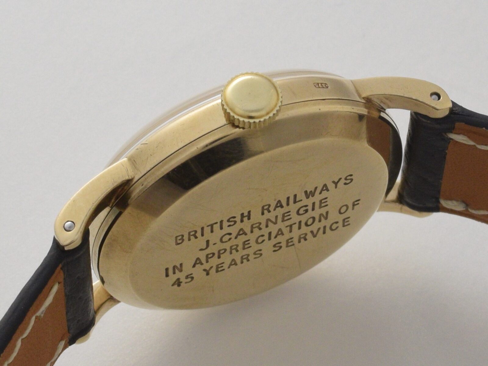 裏蓋には勤続45年でイギリス鉄道から贈られたことを示すエングレービングが施されていて、歴史を感じさせる一本です。